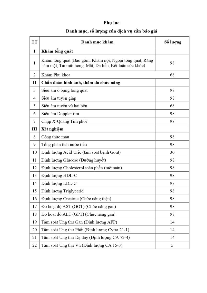 THÔNG BÁO VỀ VIỆC BÁO GIÁ DỊCH VỤ KHÁM SỨC KHỎE