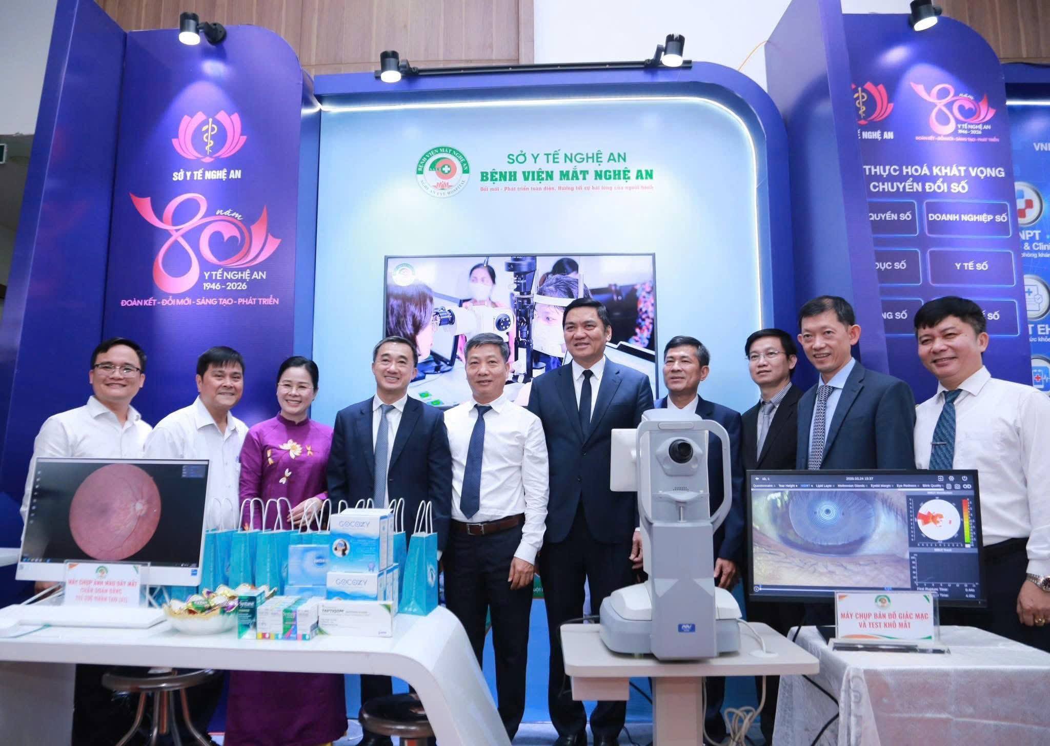 Trong khuôn khổ các hoạt động của buổi lễ, Bệnh viện Mắt Nghệ An đã tích cực tham gia trưng bày gian hàng giới thiệu các trang thiết bị y tế hiện đại, ứng dụng công nghệ tiên tiến trong khám và điều trị các bệnh về mắt. Nổi bật có thể kể đến máy chụp bản đồ giác mạc kết hợp hệ thống test khô mắt, giúp phát hiện sớm các bất thường của giác mạc và tình trạng khô mắt; máy chụp ảnh màu đáy mắt ứng dụng trí tuệ nhân tạo (AI) hỗ trợ chẩn đoán nhanh, chính xác các bệnh lý đáy mắt, góp phần nâng cao hiệu quả điều trị.