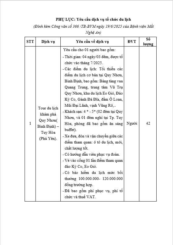 Bệnh viện Mắt Nghệ An có nhu cầu tiếp nhận báo giá để tham khảo, xây dựng giá kế hoạch, làm cơ sở tổ chức lựa chọn đơn vị cung cấp dịch vụ tổ chức du lịch cho CBCNV Bệnh viện Mắt Nghệ An năm 2025 với nội dung cụ thể như sau: