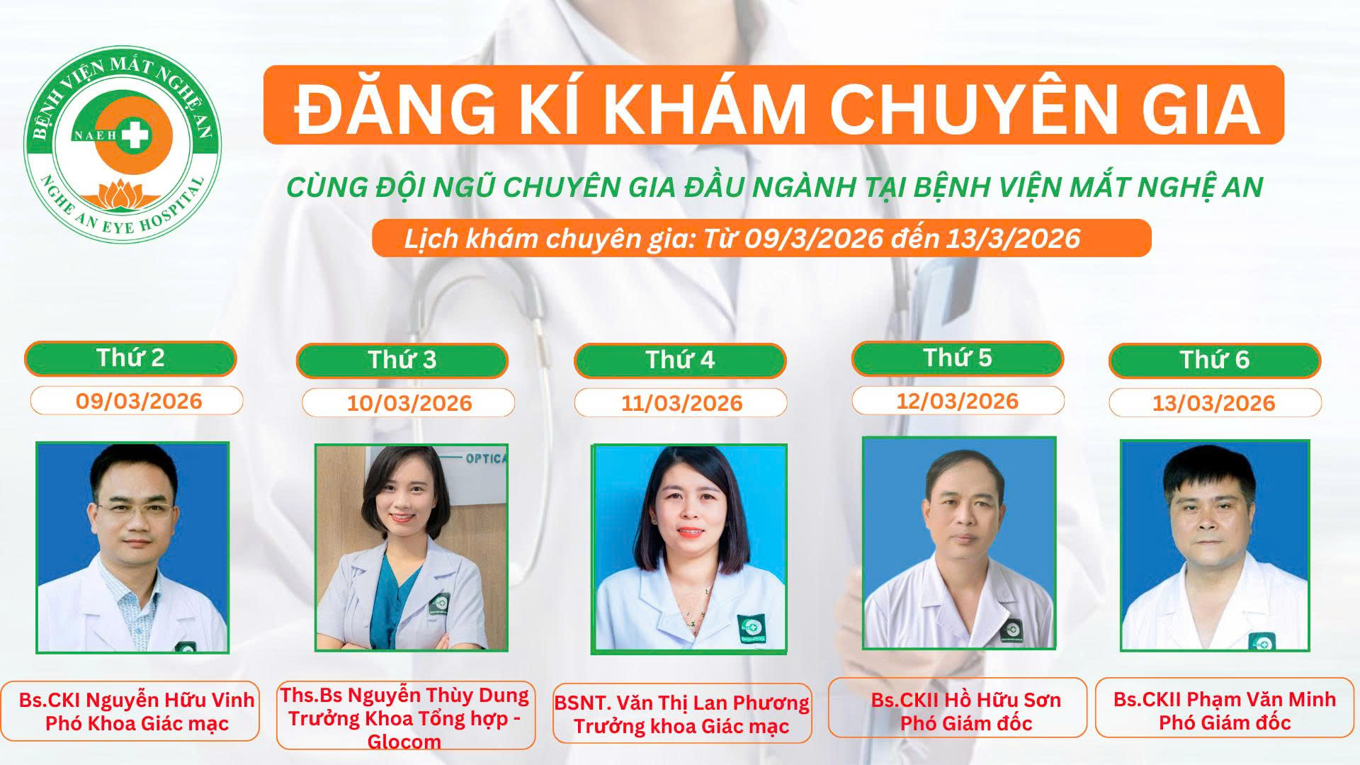 DỰ KIẾN LỊCH KHÁM CHUYÊN GIA TẠI BỆNH VIỆN MẮT NGHỆ AN THÁNG 3/2026