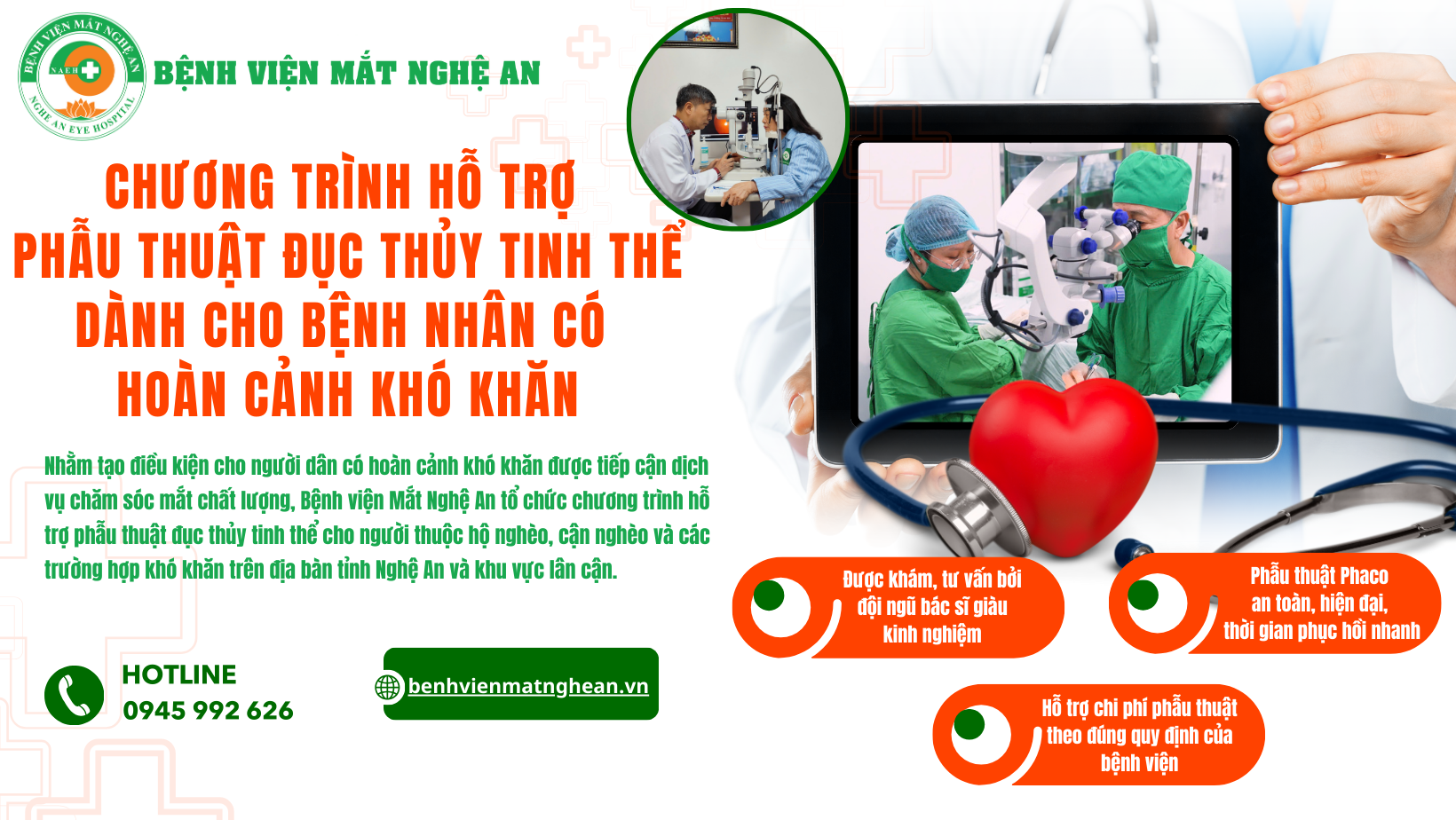 Nhằm tạo điều kiện cho người dân có hoàn cảnh khó khăn được tiếp cận dịch vụ chăm sóc mắt chất lượng, Bệnh viện Mắt Nghệ An tổ chức chương trình hỗ trợ phẫu thuật đục thủy tinh thể cho người thuộc hộ nghèo, cận nghèo và các trường hợp khó khăn trên địa bàn tỉnh Nghệ An và khu vực lân cận.