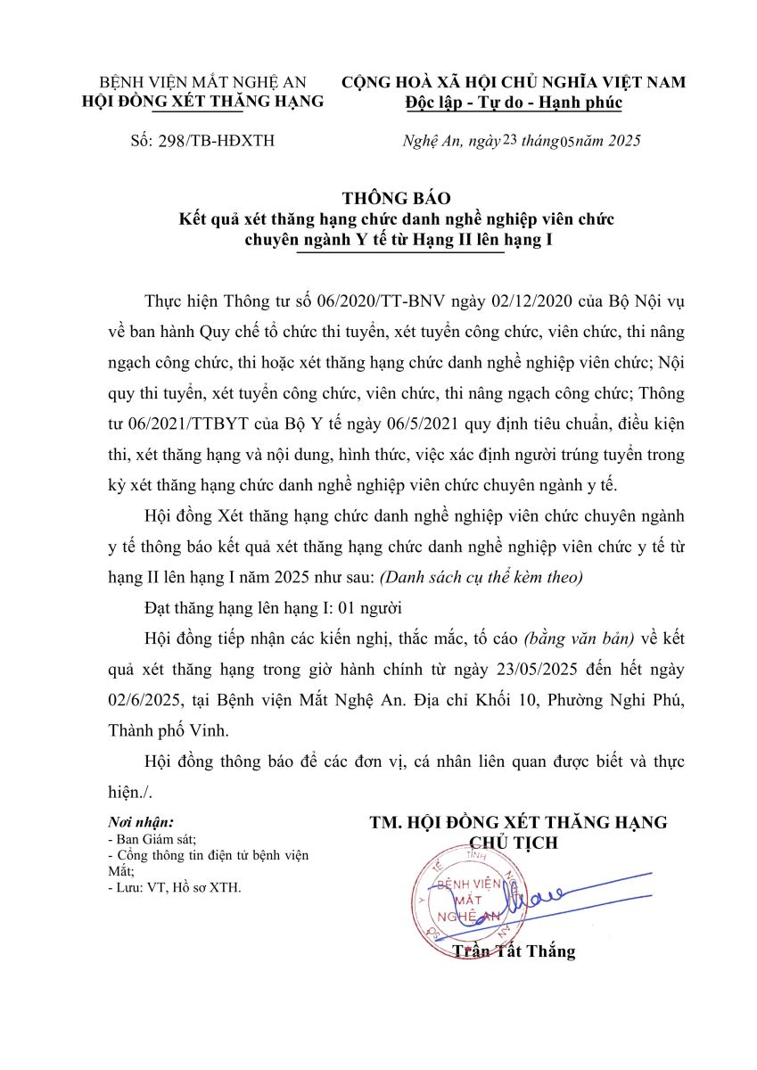 THÔNG BÁO KẾT QUẢ X ÉT THĂNG HẠNG CHỨC DANH NGHỀ NGHIỆP VIÊN CHỨC CHUYÊN NGÀNH Y TẾ TỪ HẠNG II LÊN HẠNG I