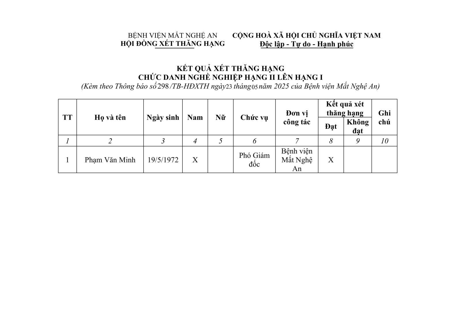 THÔNG BÁO KẾT QUẢ X ÉT THĂNG HẠNG CHỨC DANH NGHỀ NGHIỆP VIÊN CHỨC CHUYÊN NGANH Y TẾ TỪ HẠNG II LÊN HẠNG I