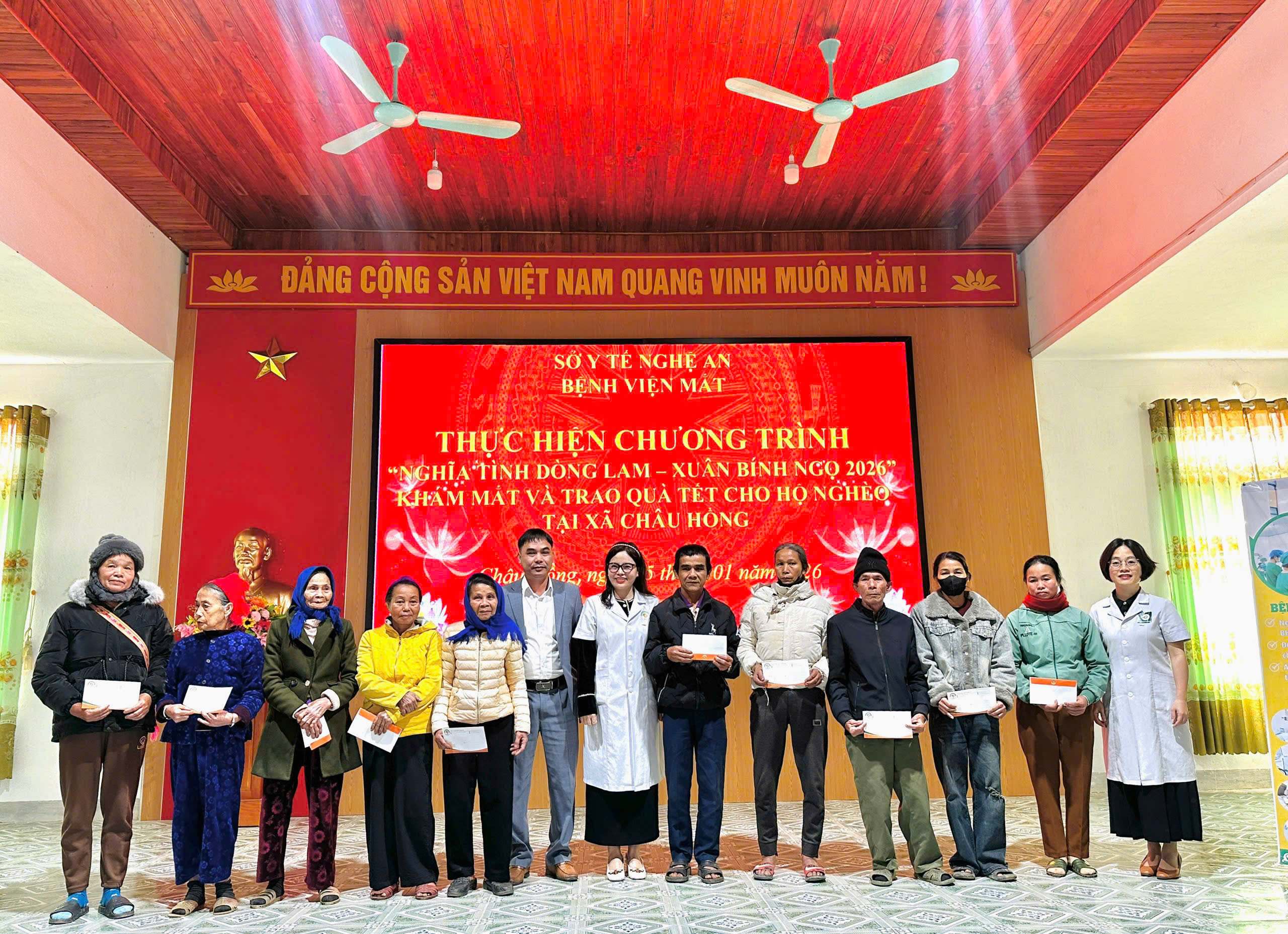 Hưởng ứng lời kêu gọi của đồng chí Bí thư Tỉnh ủy và Công đoàn phường Vinh Phú, được sự quan tâm chỉ đạo của Cấp ủy – Ban Giám đốc, ngày 25/01/2026, BCH Công đoàn Bệnh viện Mắt Nghệ An đã phối hợp cùng chuyên môn tổ chức tặng quà Tết, khám bệnh, tư vấn sức khỏe và cấp phát thuốc miễn phí cho người dân xã Châu Hồng.