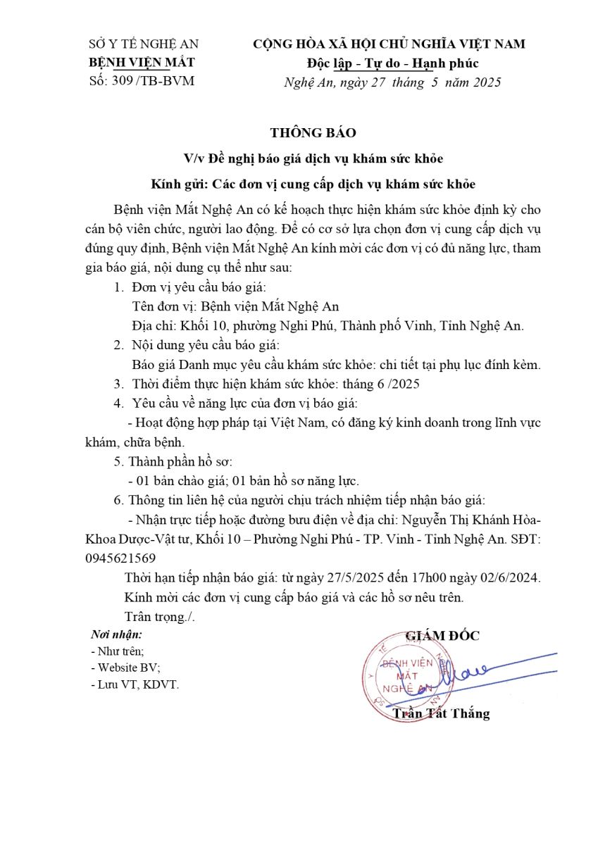 THÔNG BÁO VỀ VIỆC BÁO GIÁ DỊCH VỤ KHÁM SỨC KHỎE
