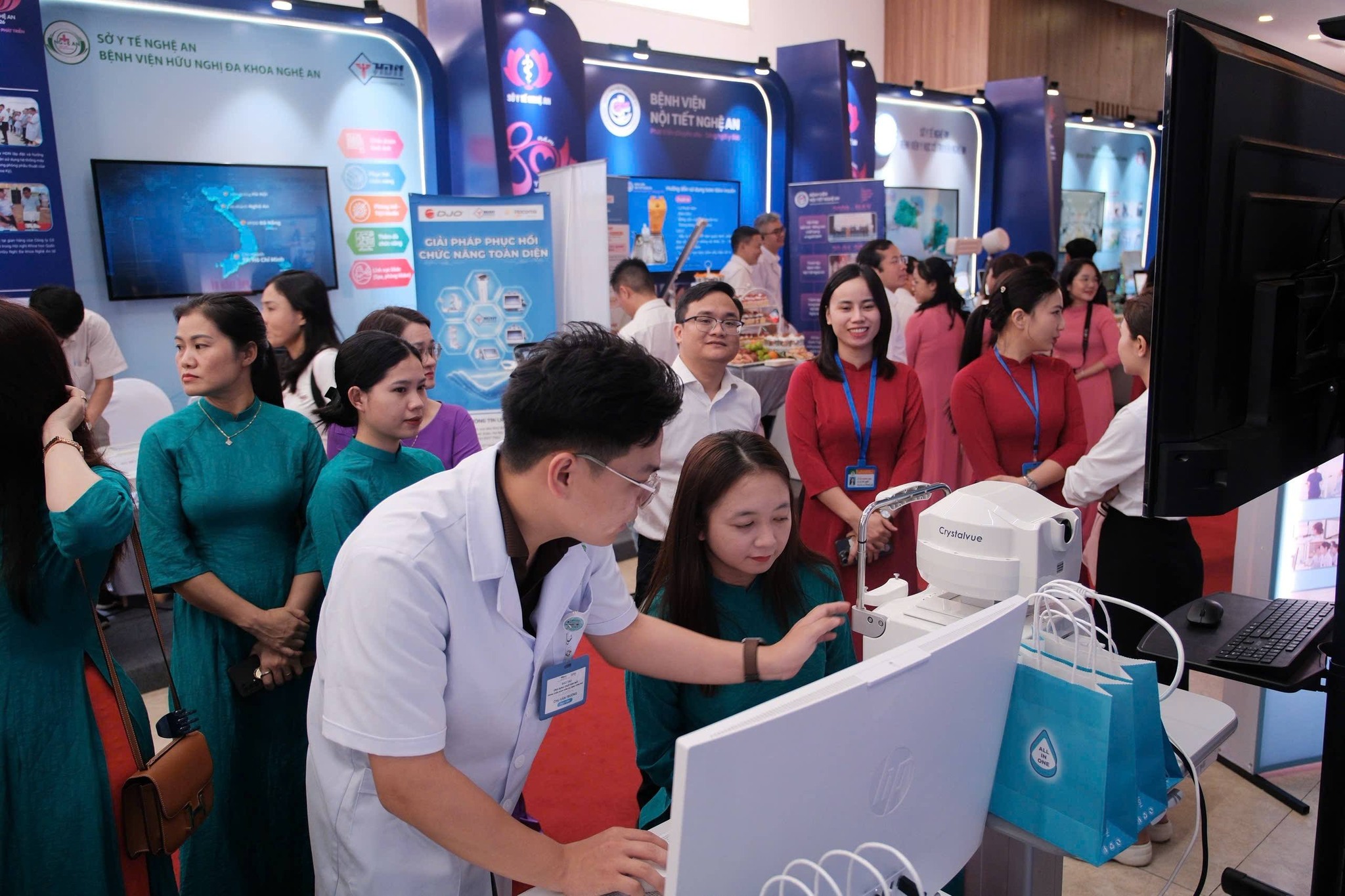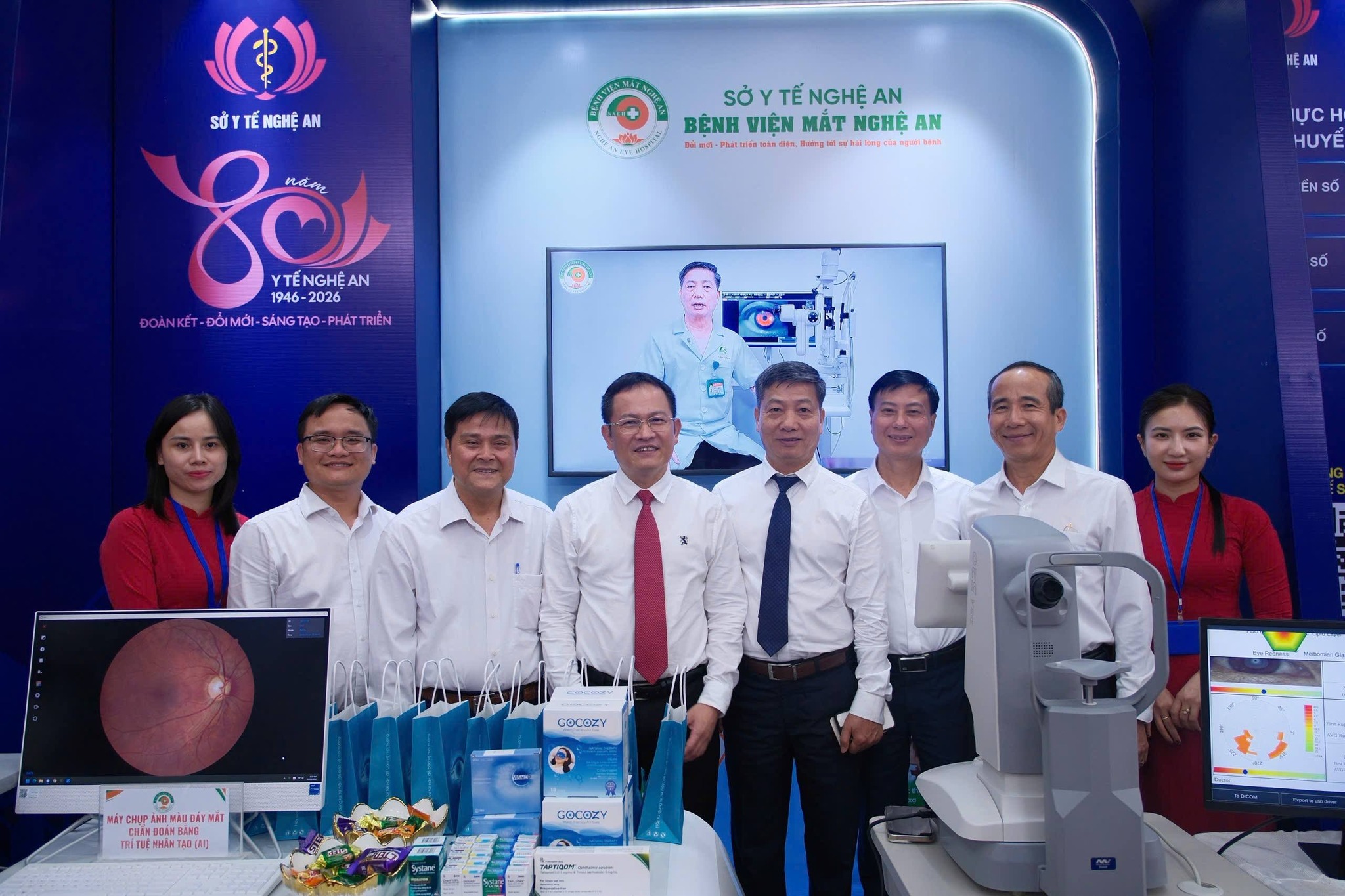Trong khuôn khổ các hoạt động của buổi lễ, Bệnh viện Mắt Nghệ An đã tích cực tham gia trưng bày gian hàng giới thiệu các trang thiết bị y tế hiện đại, ứng dụng công nghệ tiên tiến trong khám và điều trị các bệnh về mắt. Nổi bật có thể kể đến máy chụp bản đồ giác mạc kết hợp hệ thống test khô mắt, giúp phát hiện sớm các bất thường của giác mạc và tình trạng khô mắt; máy chụp ảnh màu đáy mắt ứng dụng trí tuệ nhân tạo (AI) hỗ trợ chẩn đoán nhanh, chính xác các bệnh lý đáy mắt, góp phần nâng cao hiệu quả điều trị.