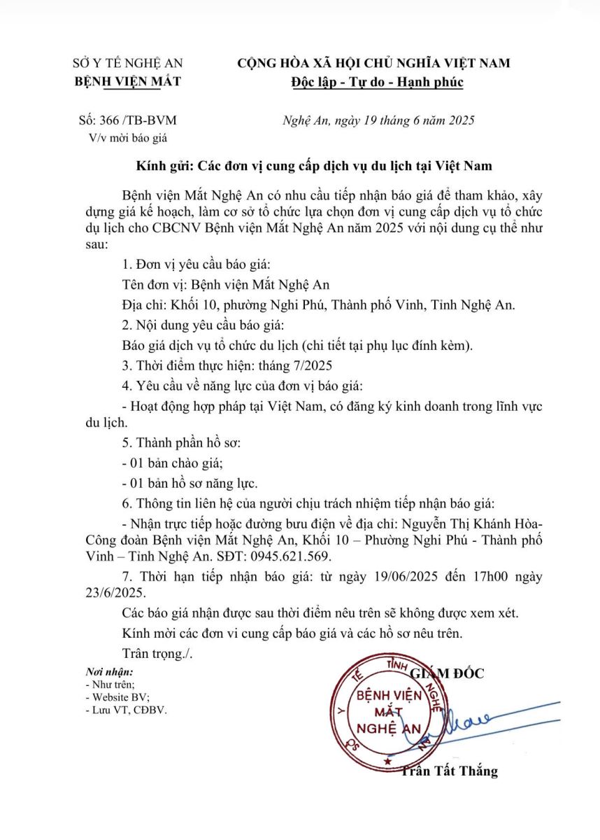 Bệnh viện Mắt Nghệ An có nhu cầu tiếp nhận báo giá để tham khảo, xây dựng giá kế hoạch, làm cơ sở tổ chức lựa chọn đơn vị cung cấp dịch vụ tổ chức du lịch cho CBCNV Bệnh viện Mắt Nghệ An năm 2025 với nội dung cụ thể như sau: