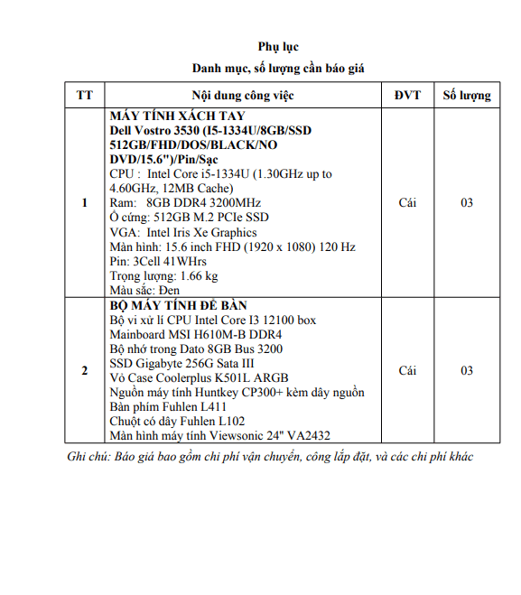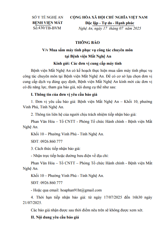 Bệnh viện Mắt Nghệ An có nhu cầu tiếp nhận báo giá để tham khảo, xây dựng giá kế hoạch, làm cơ sở tổ chức lựa chọn đơn vị cung cấp máy tính cho CBCNV Bệnh viện Mắt Nghệ An năm 2025 với nội dung cụ thể như sau: