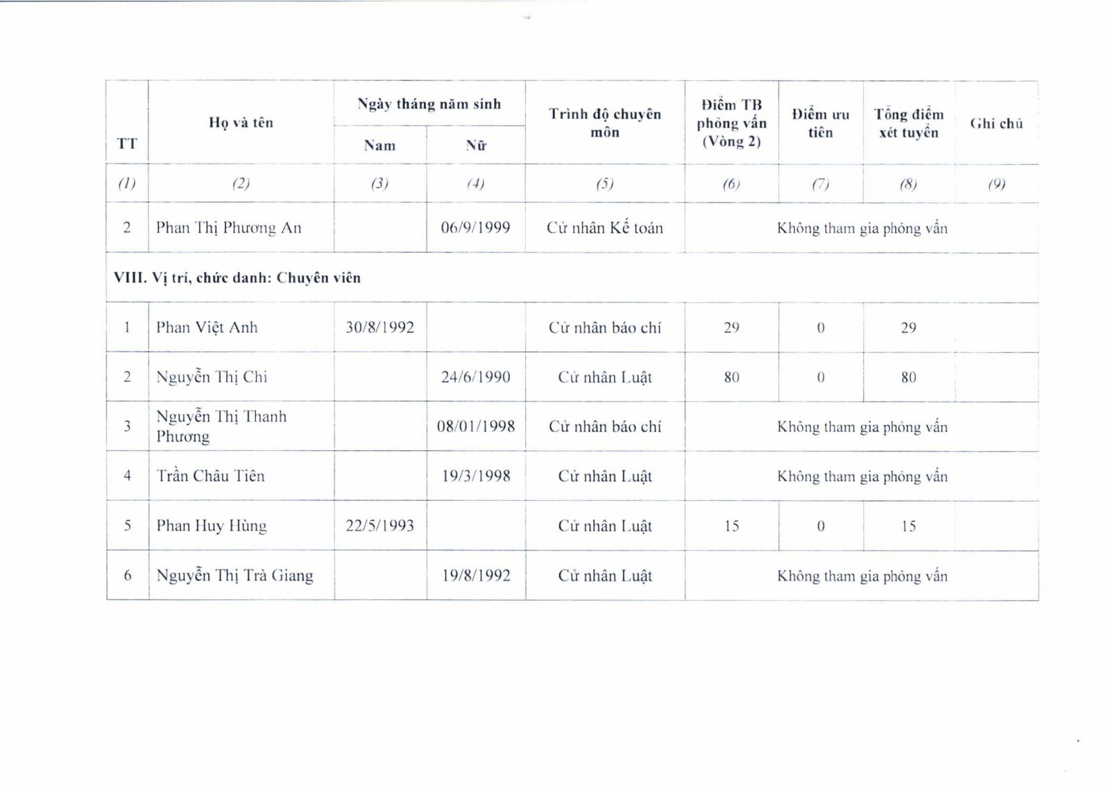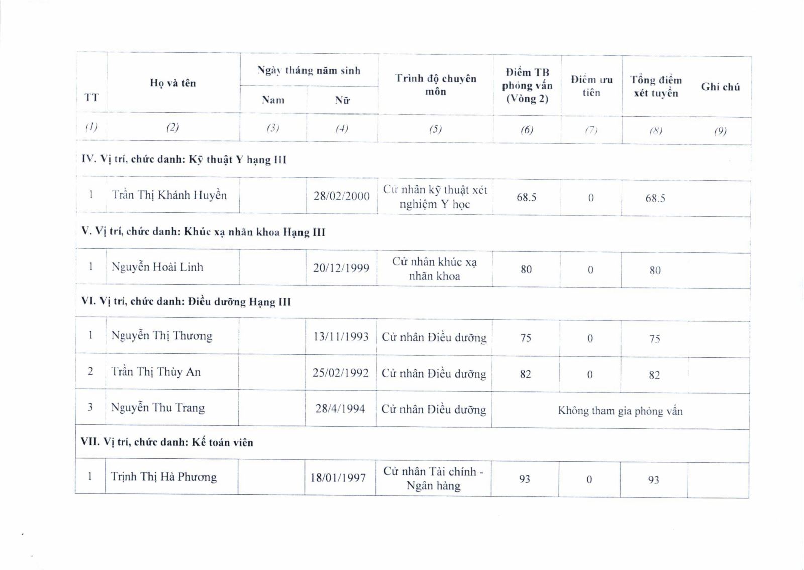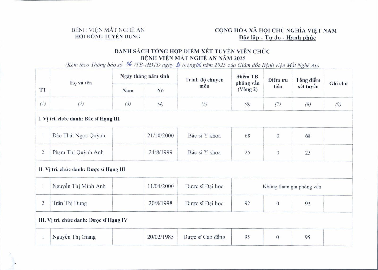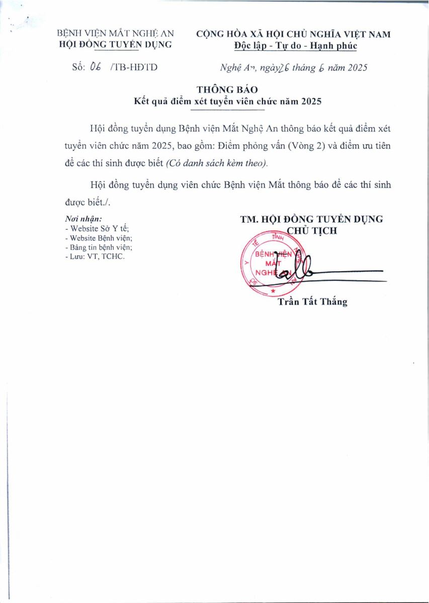 Hội đồng tuyển dụng Bệnh viện Mắt Nghệ An thông báo kết quả điểm xét tuyển viên chức năm 2025 như sau: