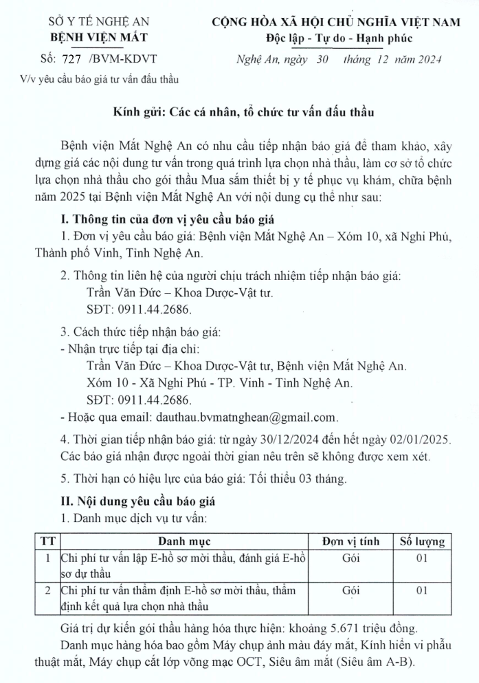 Bệnh viện Mắt Nghệ An có nhu cầu tiếp nhận báo giá để tham khảo, xây dựng giá các nội dung tư vấn trong quá trình lựa chọn nhà thầu, làm cơ sở tổ chức lựa chọn nhà thầu cho gói thầu Mua sắm thiết bị y tế phục vụ khám, chữa bệnh năm 2025 tại Bệnh viện Mắt Nghệ An với nội dung cụ thể như sau: